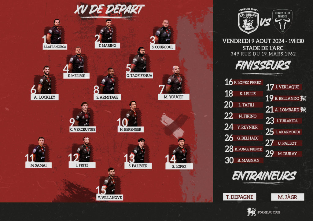 Voici le XV de départ pour ce match de préparation, CO Berre XV VS RC Nîmois, aujourd’hui à 19h30.