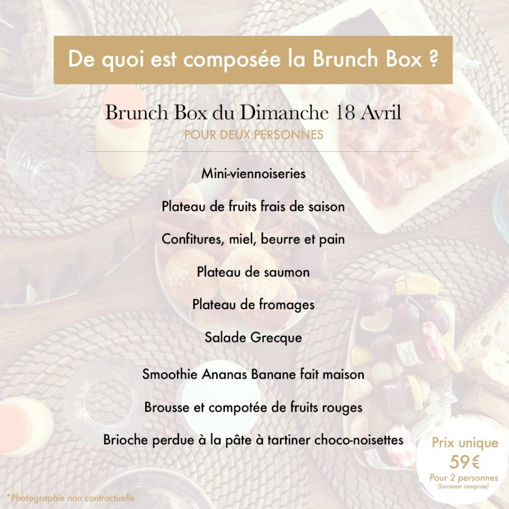 BRUNCH 🌸Imitée depuis son lancement mais jamais égalée … nous sommes heureux de vous annoncer que la brunch box by Marius Traiteur est de retour en édition limitée 🤩Au menu cette semaine : mini-viennoiseries, fruits de saison, confitures, miel, beurre et pain, plateau de saumon, plateau de fromages, salade Grecque, smoothie frais fait maison, brousse et compotée de fruits rouges et brioche perdue à la pâte à tartiner 🤤🔸Comment ça marche 👇Commandez directement votre brunch du dimanche en ligne, et faites vous livrer ce dimanche matin !