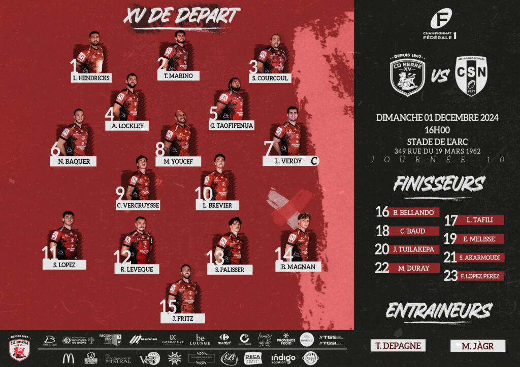 Voici le XV de départ pour cette dixième journée de Fédérale 1, CO Berre XV e vs CS Nuiton, demain à 16h00.