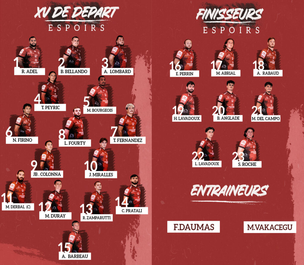 Voici le XV de départ de nos espoirs pour cette neuvième journée de championnat, CS Villefranche vs CO Berre XV, aujourd’hui à 13h30.